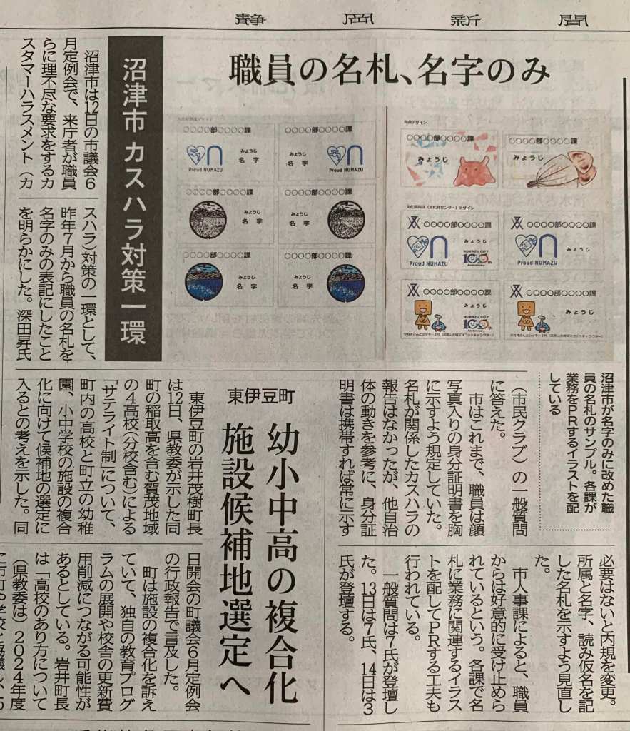 本会議で取り上げたカスハラ対策についての静岡新聞さんの記事です。