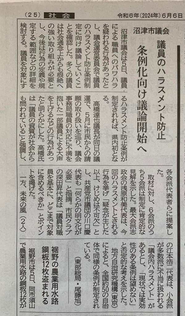 6/5(水)の議会運営委員会で「議員から市役所職員へのハラスメント行為の疑い」について取り上げられました。